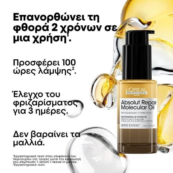 Ένα πατενταρισμένο διφασικό έλαιο, με ανάλαφρη υφή, γρήγορη απορρόφηση, και άρωμα σχεδιασμένο από κορυφαίους αρωματοποιούς για μεγάλη διάρκεια. Επανορθώνει τη φθορά 2 χρόνων, χαρίζοντας 100 ώρες λάμψης*, έλεγχο του φριζαρίσματος για 3 ημέρες και 3 φορές περισσότερη θρέψη, χωρίς να βαραίνει τα μαλλιά. Τα μαλλιά είναι πιο δυνατά, με βελτιωμένη ελαστικότητα, κίνηση και απαλότητα.